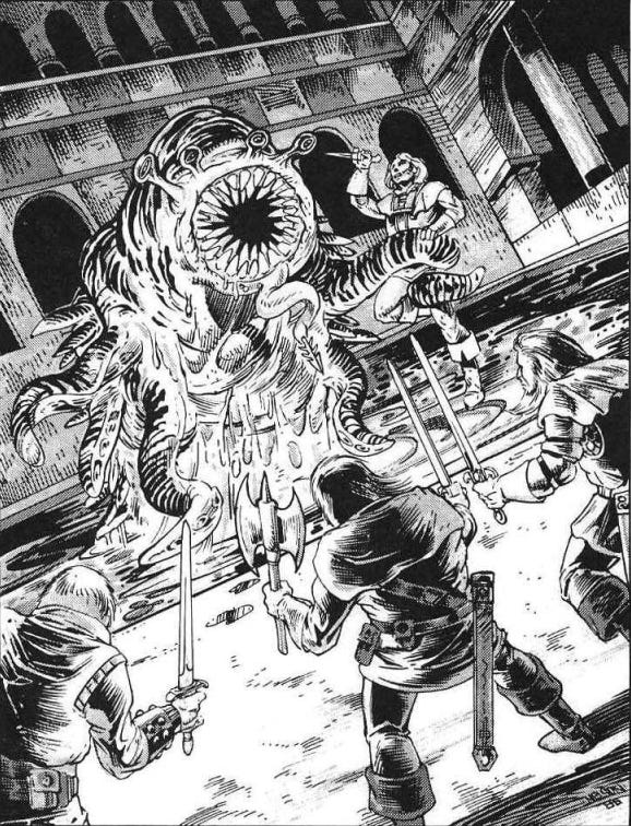 Despite correctly deciding they shouldn't mess with the fetid bathing pool with rotting body parts floating in it, the wizard just had to poke his staff in. Tentatively, of course. Just checking. Several rounds later the 7th level priest lay dying, so was the 5th level Pit Fighter who somehow managed to fail like five CON checks in a row. And the 4th level Sea Wolf? Being digested alive deep in the worm's belly.